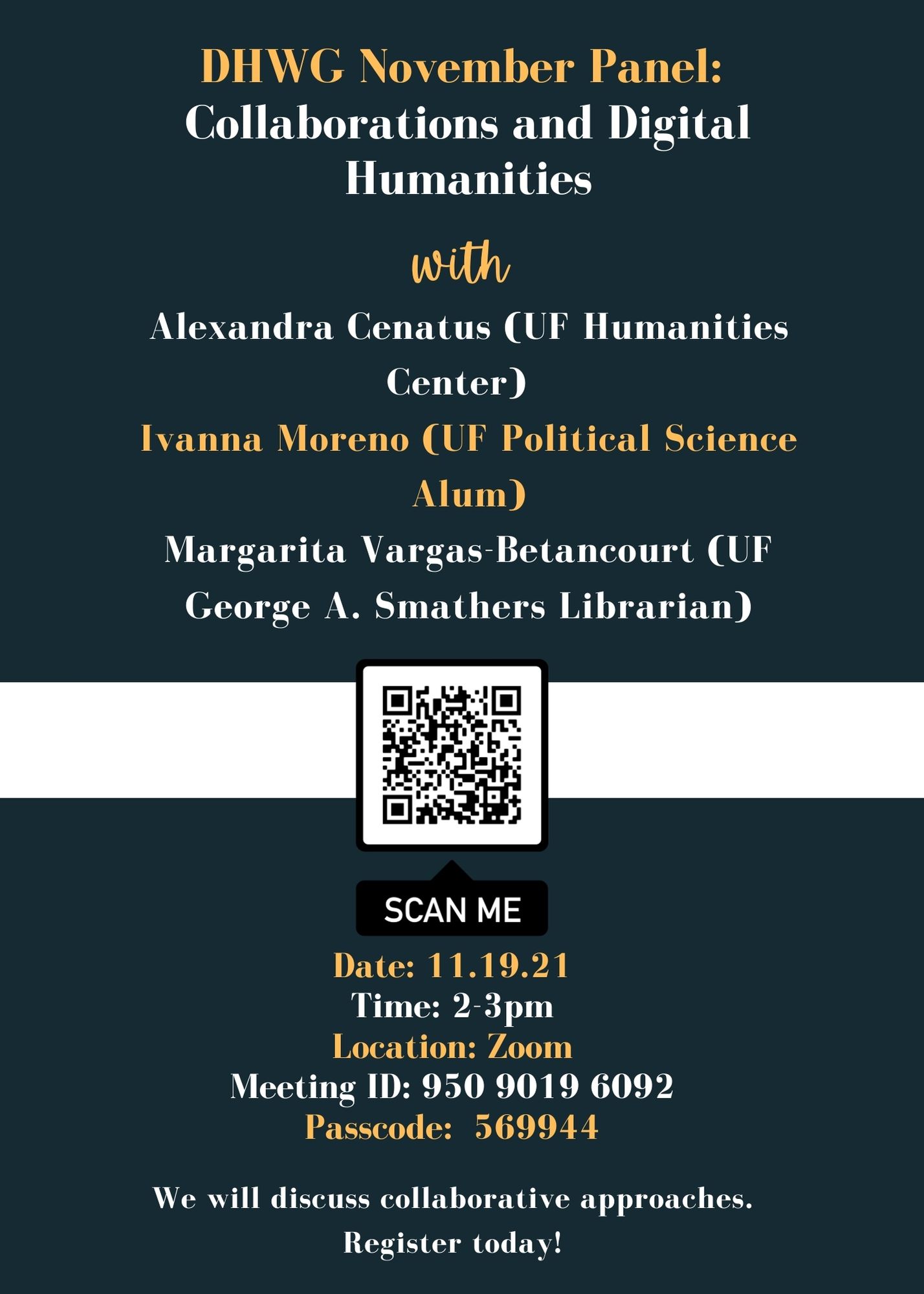 In this last DHWG event of the fall semester scheduled for Friday, November 19, at 2:00 pm EDT and moderated by Hélène Huet (George A. Smathers Librarian), we’re discussing collaborations and digital humanities. Alexandra Cenatus, Ivanna Moreno, and Margarita Vargas-Betancourt will share their cross-disciplinary and cross-departmental collaborations on The Haitian American Dream<https://nam10.safelinks.protection.outlook.com/?url=https%3A%2F%2Fexhibits.uflib.ufl.edu%2FHaitianAmericanDream%2F&data=04%7C01%7Ca.pfister%40UNF.EDU%7Ce80ec2b397a14443cd5a08d9a9d5496d%7Cdf29b2fa8929482f9dbb60ff4df224c4%7C1%7C0%7C637727557017268624%7CUnknown%7CTWFpbGZsb3d8eyJWIjoiMC4wLjAwMDAiLCJQIjoiV2luMzIiLCJBTiI6Ik1haWwiLCJXVCI6Mn0%3D%7C3000&sdata=XPnJnswg8BtznBlnFFnGeqtPqvBpe18bG9m%2F2Es7LyU%3D&reserved=0>, a digital project centering the stories of Haitian immigrants in the United States from the 19th century to the present day. The Haitian American Dream challenges colonial immigration narratives and highlights the complex, centuries-old relationship between the people of Haiti and the United States foreign policies that force them to migrate. Alexandra Cenatus’, Ivanna Moreno’s, and Margarita Vargas-Betancourt’s roles as project leaders and disciplinary experts in the Center for the Humanities and the Public Sphere, the George A. Smathers Libraries, and the Mellon Intersections Group on Global Blackness and Latinx Identity highlight the partnerships, resources, and impacts necessary to sustain a local and internationally-relevant digital humanities community at the University of Florida.