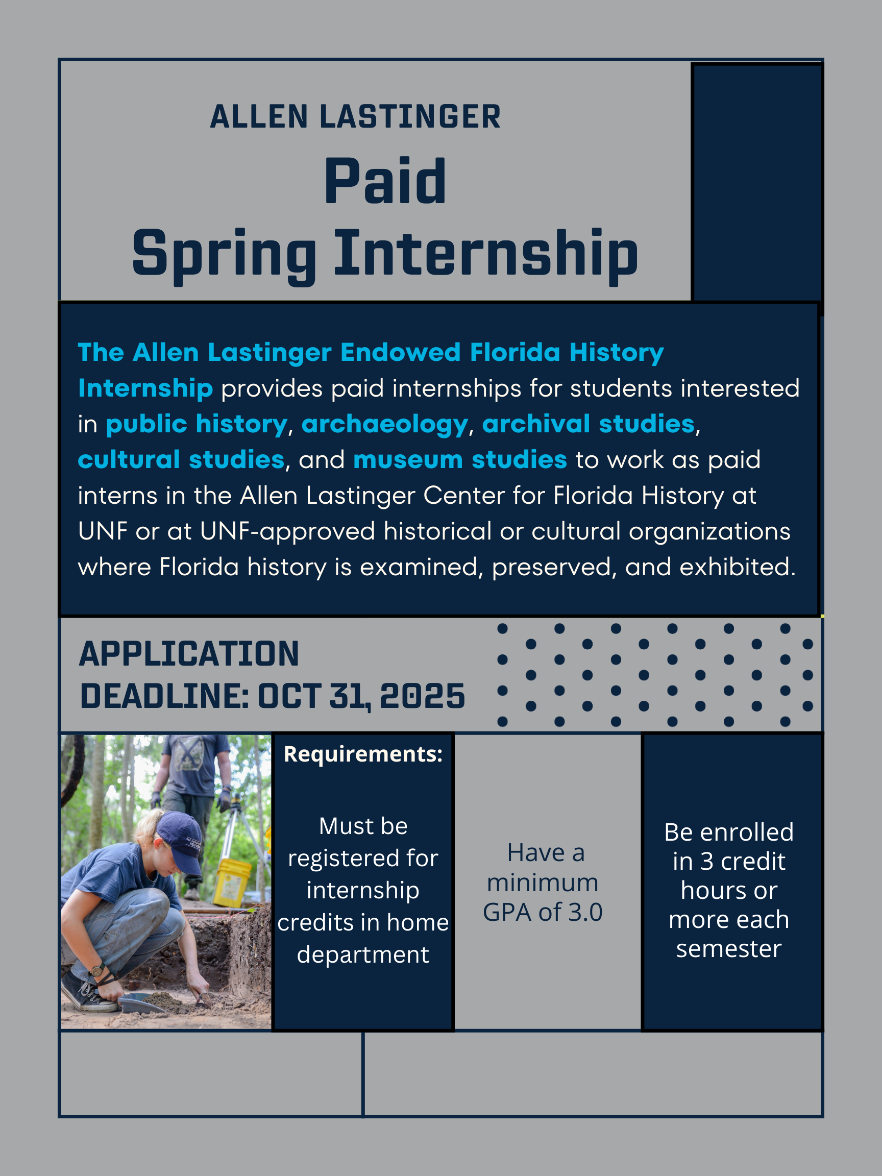This is an award that will support students while interning in public history, archaeology, cultural studies, and museum studies to work as paid interns in the Allen Lastinger Center for Florida History at UNF and at UNF-approved historical or cultural organizations where Florida history is being examined, preserved and exhibited. Please share the attached advertisement and application with your students.